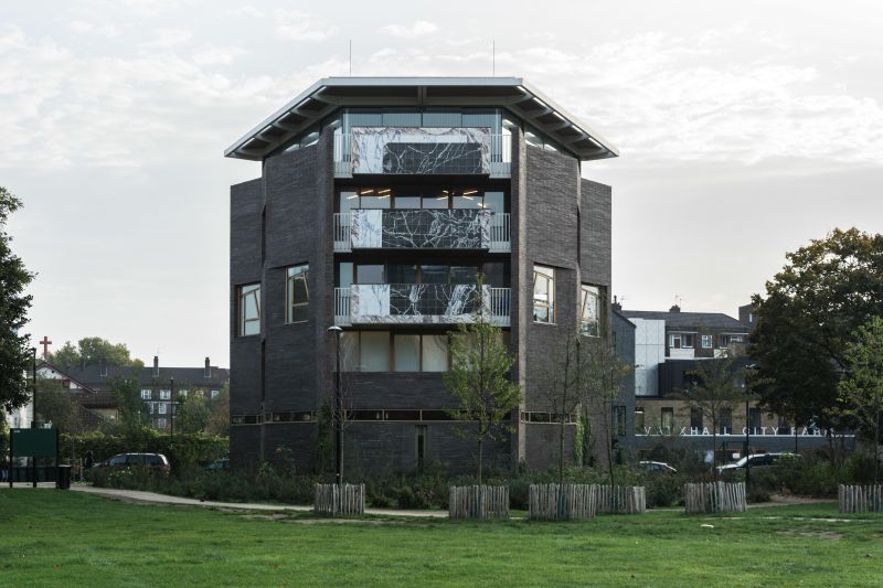 The project was deliberately left unfinished, to be completed whilst in occupation by the artist. Walls were left as unpainted plaster with trompe-l’oeil skirting boards. The artist’s designs were printed onto Formica for door and cabinetry finishes. The internal layout is arranged to create a view of the trees in the park and city beyond when reclining in the bath.