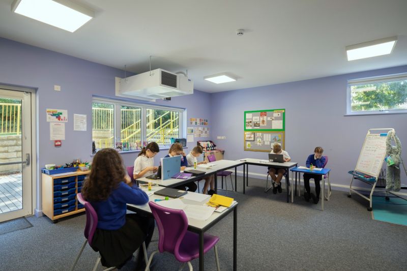 The design eliminates the need for corridors which would be physically restrictive to students requiring BSL to communicate. The two storeys are connected to the school’s existing art block via a new link which provides covered and screened external access to the new first-floor classrooms, and a covered link via a new courtyard at ground floor. A much-needed new lift provides access to the two levels, while the new paved areas help to connect and activate the play spaces around the edges of the campus.