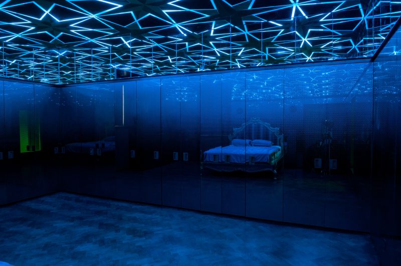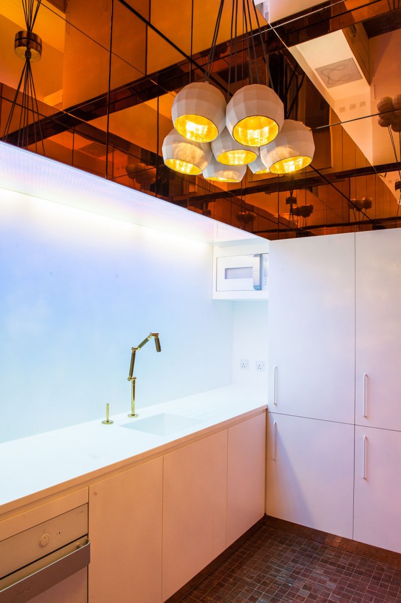 A residential interior lined in mirrors, secreted behind a bookcase in Islington.