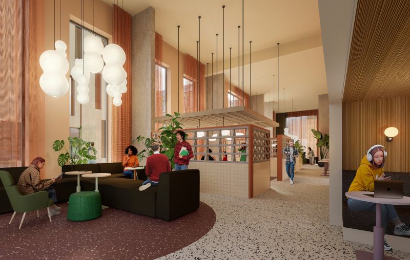 Due to provide homes for 551 students in 2025, our interior design draws upon our team’s experiences living in Glasgow as students themselves, incorporating bespoke joinery, graphic surfaces and curated artwork collections which reference the city’s gridiron layout and its distinctive and rich sandstone palette with tiled and painted patterns.