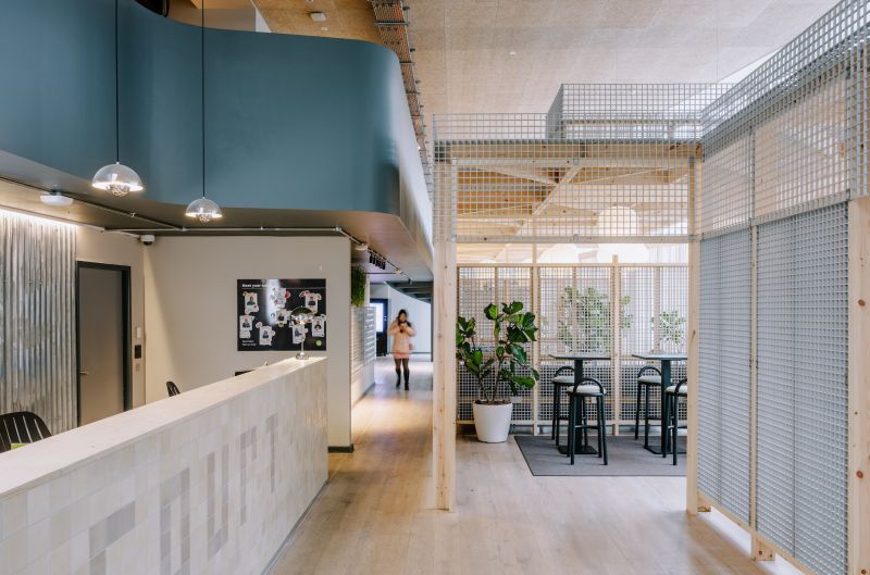 Our design draws inspiration from the historic street plan of Mile End; tightly knit streets opening into courts, with a material approach which ensures stylistic longevity and future flexibility. It introduces a calming, warm and neutral palette of materials including corrugated aluminium, exposed timber framing and a fibreglass mesh screen which buffers and shields students whilst allowing natural light to penetrate into the space.