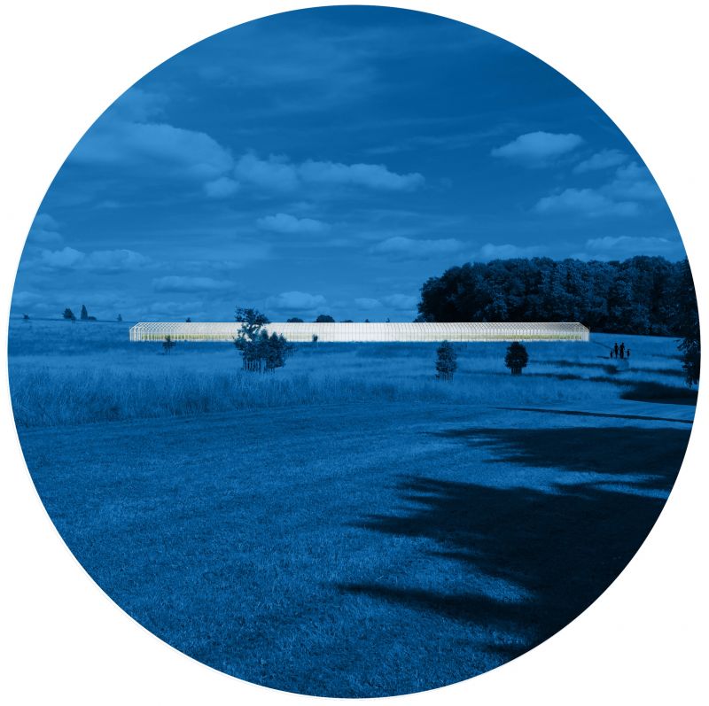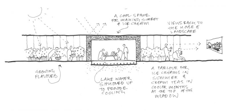 Competition entry for “Eyecatcher” installation in the Meadow at Compton Verney Art Gallery. An extended greenhouse, growing fruiting plants and herbs, with a central sheep’s-wool-insulated parlour for making ice cream and sorbets.