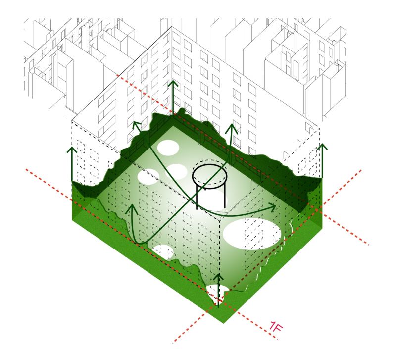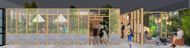 Our developing interior and landscape designs for study, social and gallery spaces for a new student housing project in Norwich; converting a brutalist 70s office building with an abandoned jungle at its centre into a home for 650 students.