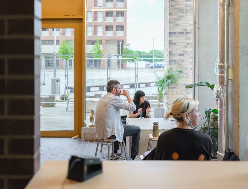 Building services are restricted to high level, and the use of underfloor heating keeps the spaces clear of the usual visual clutter of equipment and radiators, maximising flexibility for exhibition & performance programming. The soundproofed broadcast booth faces directly onto the café, with a sliding glazed window which enables an immediate connection between performers and audience.